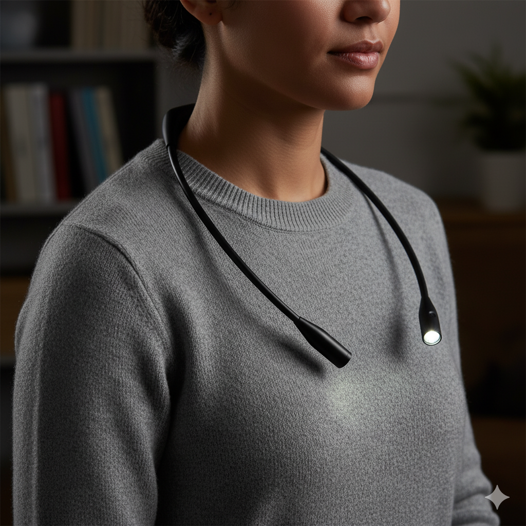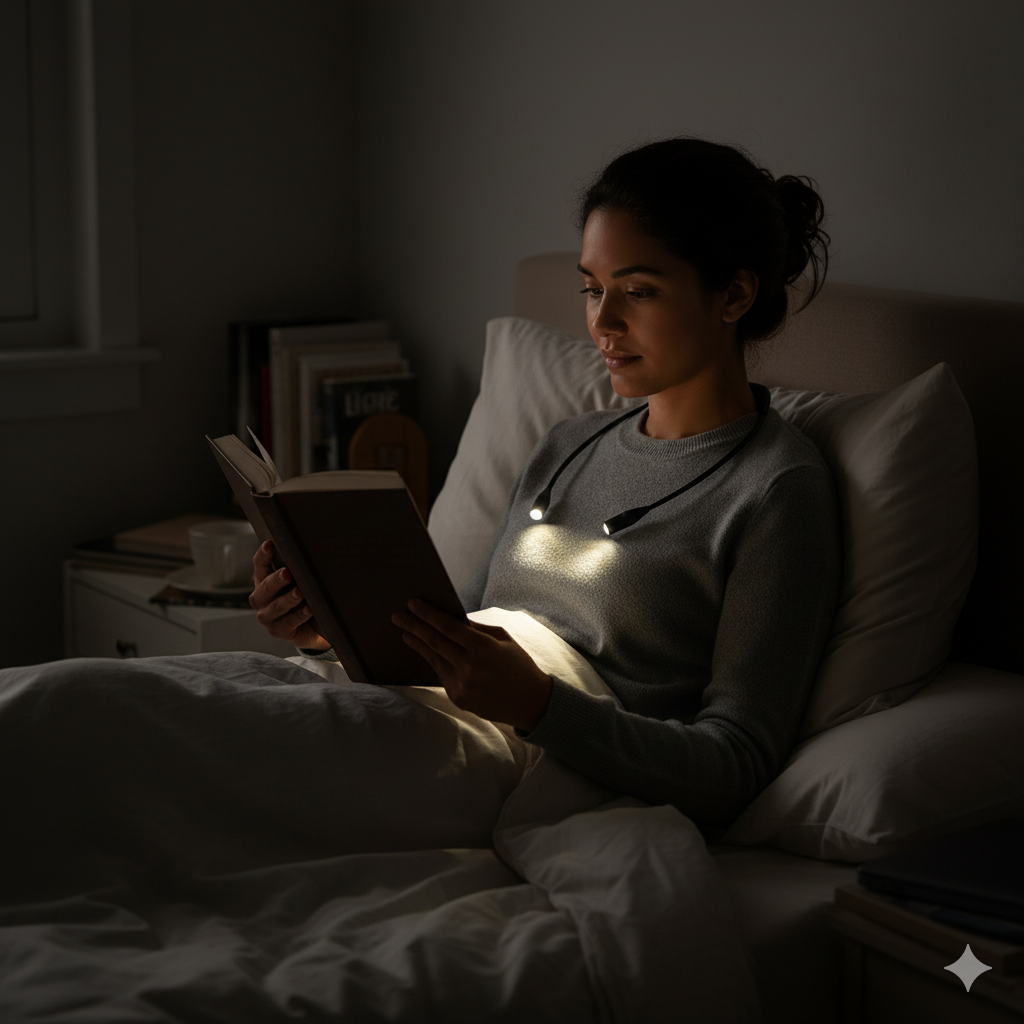 - ‘s Avonds voor het slapengaan een boek lezen. U kunt uw grote licht alvast uitzetten en toch met voldoende licht uw favoriete boek lezen doordat u uw leeslamp om uw nek heeft hangen.